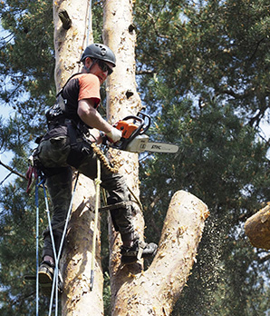 Арборист убирает сильно разросшуюся крону, растущие ветки и производит удаление пней и порубочных остатков.